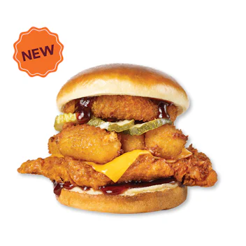 Crispy Chicken, Cheddar Cheese, Cheese Curds, BBQ Sauce, Pickles and Onion Ring. Served with fries, NO drink